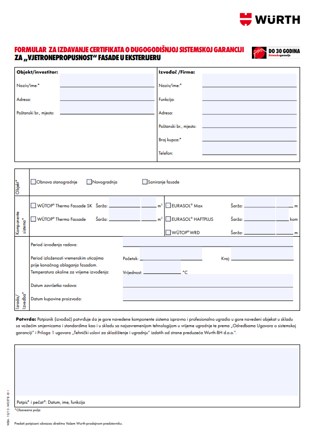 | Formular | Formular za za izdavanje certifikata o sistemskoj garanciji za zaptivanje od vjetra u vanjskom području za fasade | Preuzmi pdf verziju |
