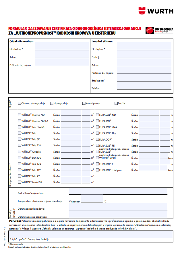 | Formular | Formular za za izdavanje certifikata o sistemskoj garanciji za zaptivanje od vjetra u vanjskom području za kose krovove | Preuzmi pdf verziju | |