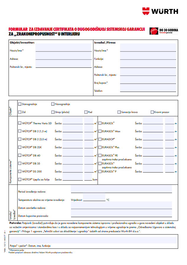 | Formular | Formular za za izdavanje certifikata o sistemskoj garanciji za zaptivanje od zraka u unutrašnjem području | Preuzmi pdf verziju | |